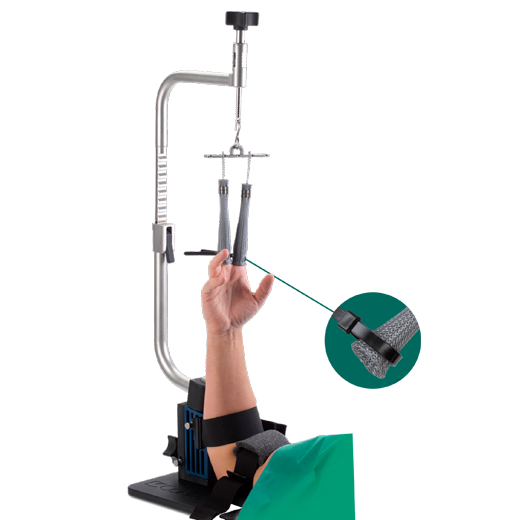 La HandStand™ traction tower de Conmed, que cuenta con maniobrabilidad mejorada, sujetadores estériles, un montaje más intuitivo y un diseño liviano. Gracias a que está hecha de aluminio liviano, todo el sistema pesa menos de 5 kilogramos, que permiten una esterilización, transporte, montaje y desmontaje sin complicaciones. Su diseño facilita al cirujano flexionar, extender el brazo del paciente, ya que puede girar hasta 180 grados con incrementos de 15 grados para un acceso total al antebrazo y para acomodar el uso de fluoroscopia durante el uso artroscópico. Su brazo también se puede doblar hasta 70 grados en cualquier dirección, lo que posibilita adaptarse a la flexión y extensión de la muñeca.