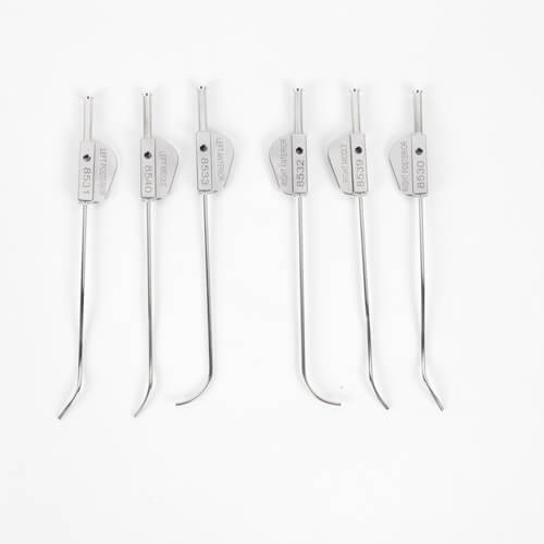 Cuenta con seis cánulas precurvadas de diferentes tamaños, para izquierda y derecha que brindan un acceso óptimo a todas las zonas del menisco con extremos en forma cónica que hacen que la carga de agujas sea segura y sencilla. Ademas tienen la cualidad de sus puertos de ventilación de fluido, que dirigen el líquido lejos del campo visual.